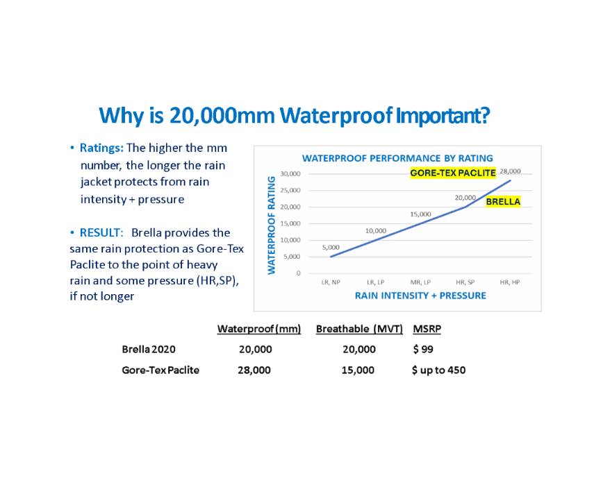 Brella is made with 20K waterproof, breathable materials with fully taped seam construction, designed to keep you dry through downpours, long walks, and unexpected rain and wind storms.