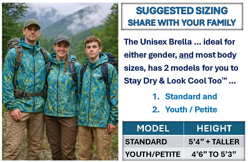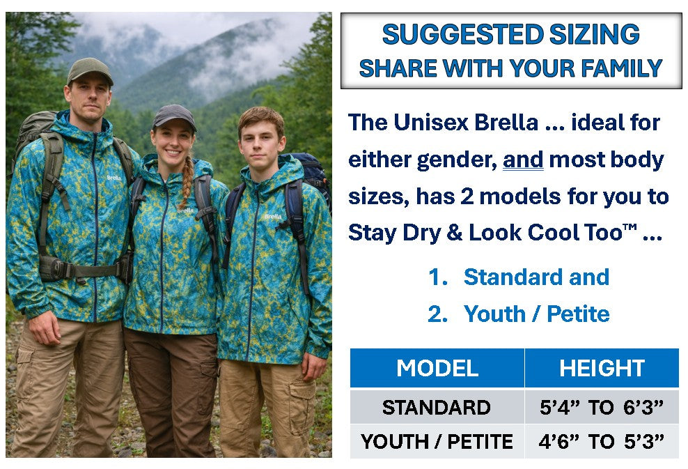 You don’t need multiple rain jackets—or multiple sizes. Brella handles it all. Sharable .