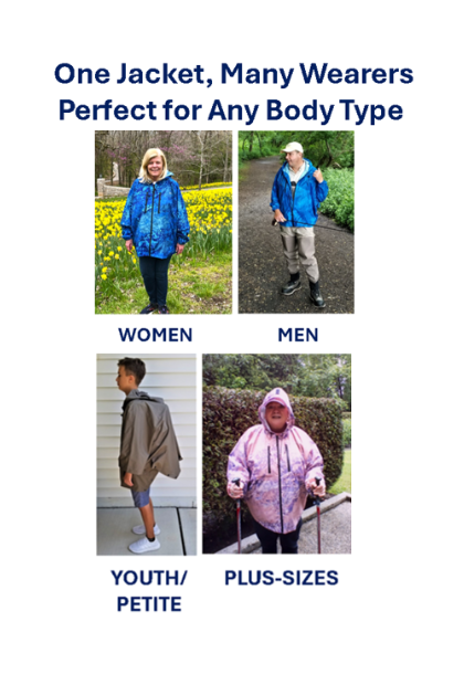 The patented, unisex, one-size-fits-most rain jacket is designed to eliminate sizing guesswork, deliver real rain protection, allow you to customize the fit, and showcase your style or brand.